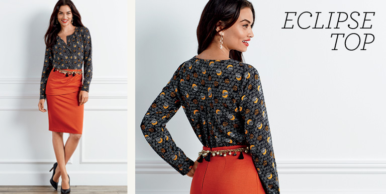 Add a little flair to your workwear with the Eclipse Top, featuring a show-stopping pattern and a modern, collarless neckline with snaps that sets this blouse apart. Go over-the-top with a bold pencil and a decorative belt.