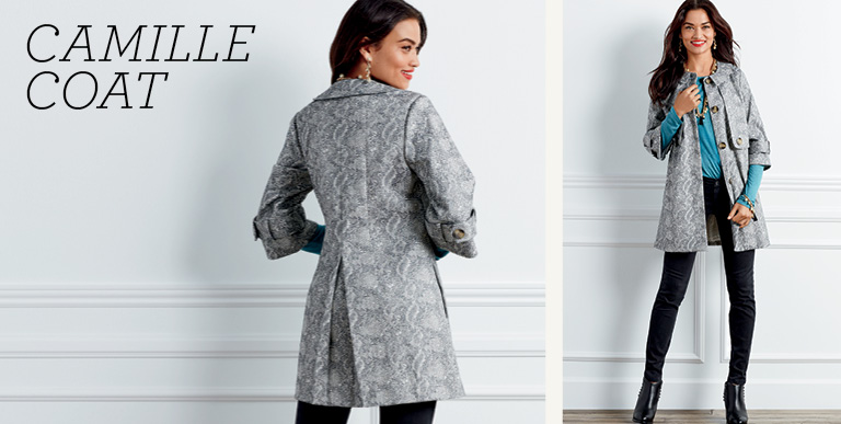 This one’s straight off the runway! The Camille Coat, with a unique jacquard skin print has details like horn-rimmed buttons and an inverted box pleat in the back. This is truly a one-of-a-kind piece.