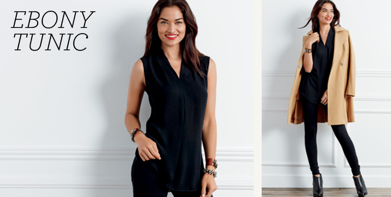 Every fashionista needs a head-to-toe black ensemble in her closet, and the Ebony Tunic is the one that completes ours. Wear it over leggings with a camel topcoat for effortless fall style.