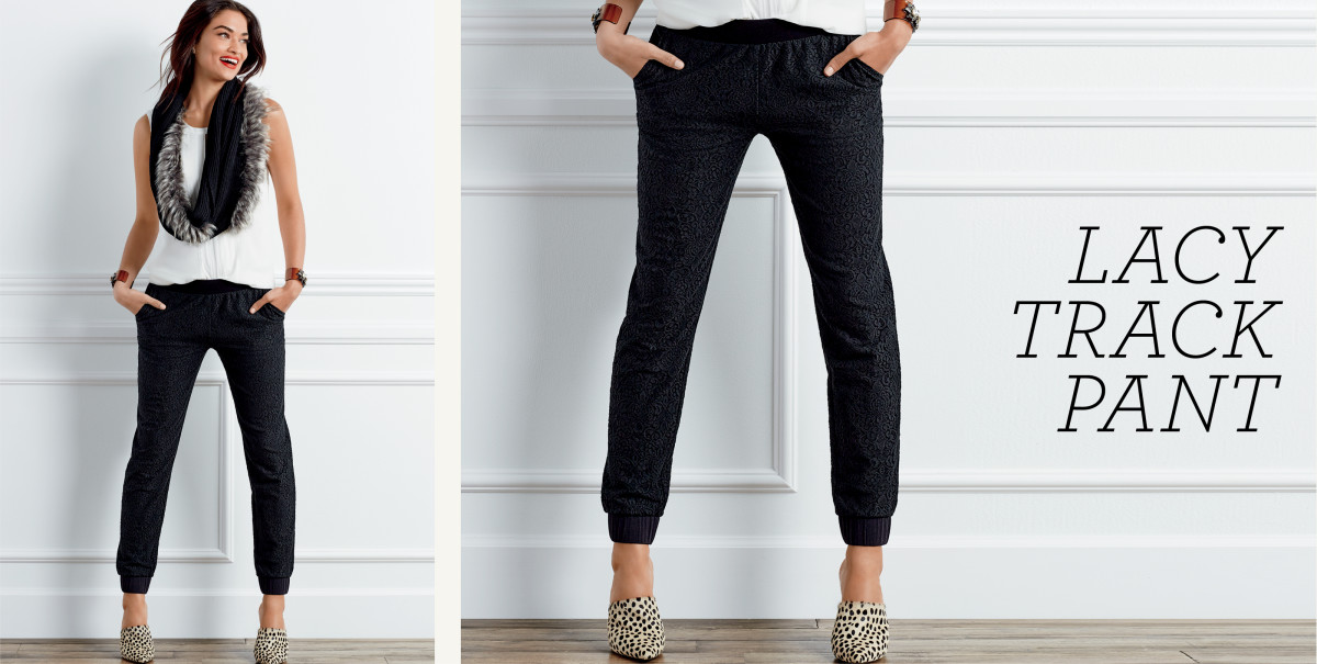 For an instant style update, we’re all about our casually cool Lacy Track Pant, featuring an elastic hem that practically begs for a statement pump or mule.