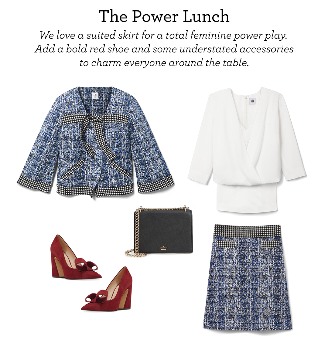 Featured Items: 21 Club Jacket, 21 Club Skirt, Indulge Blouse, Nine West Block Pumps, Kate Spade Crossbody