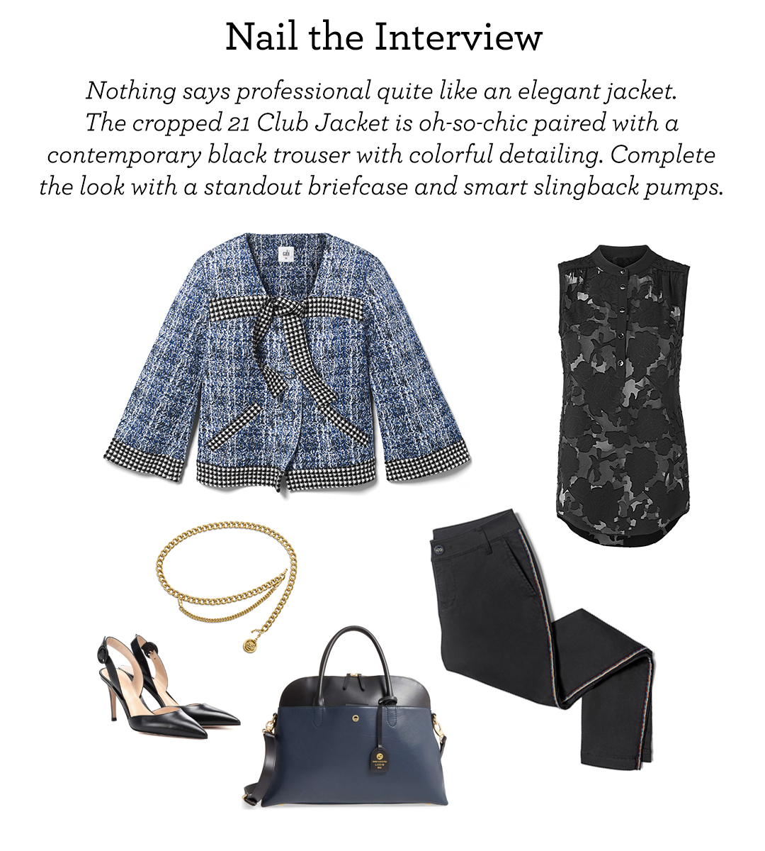 Featured Items: 21 Club Jacket, Clip Art Blouse, The Peyton, Charm Belt, Lodis Briefcase, Gianvito Rossi Pumps