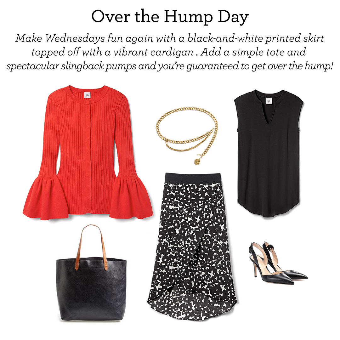 Featured Items: Dixon Skirt, Notch Tee, Trumpet Cardi, Charm Belt, Topshop Slingback Pump, Madewell Tote