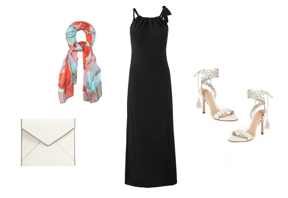 Featured Items: Bow Halter Maxi, Gingham Scarf, Schutz Wrap Sandals, Rebecca Minkoff Clutch