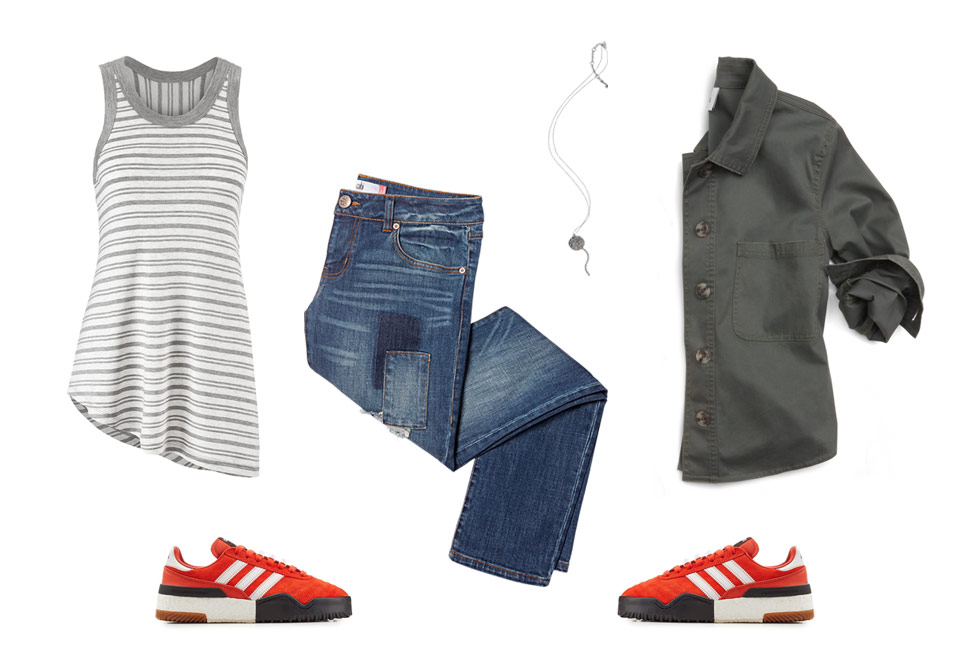Featured Items: Crossroads Jacket, Side Out Tank, Slim Boyfriend, Te Amo Necklace, Adidas Sneakers
