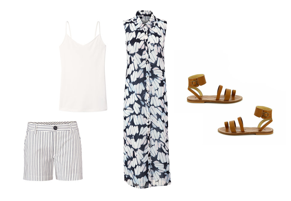 Featured Items: Shirt Dress (as a vest), V-Neck Cami (White), Viva Short, K. Jacques Sandals