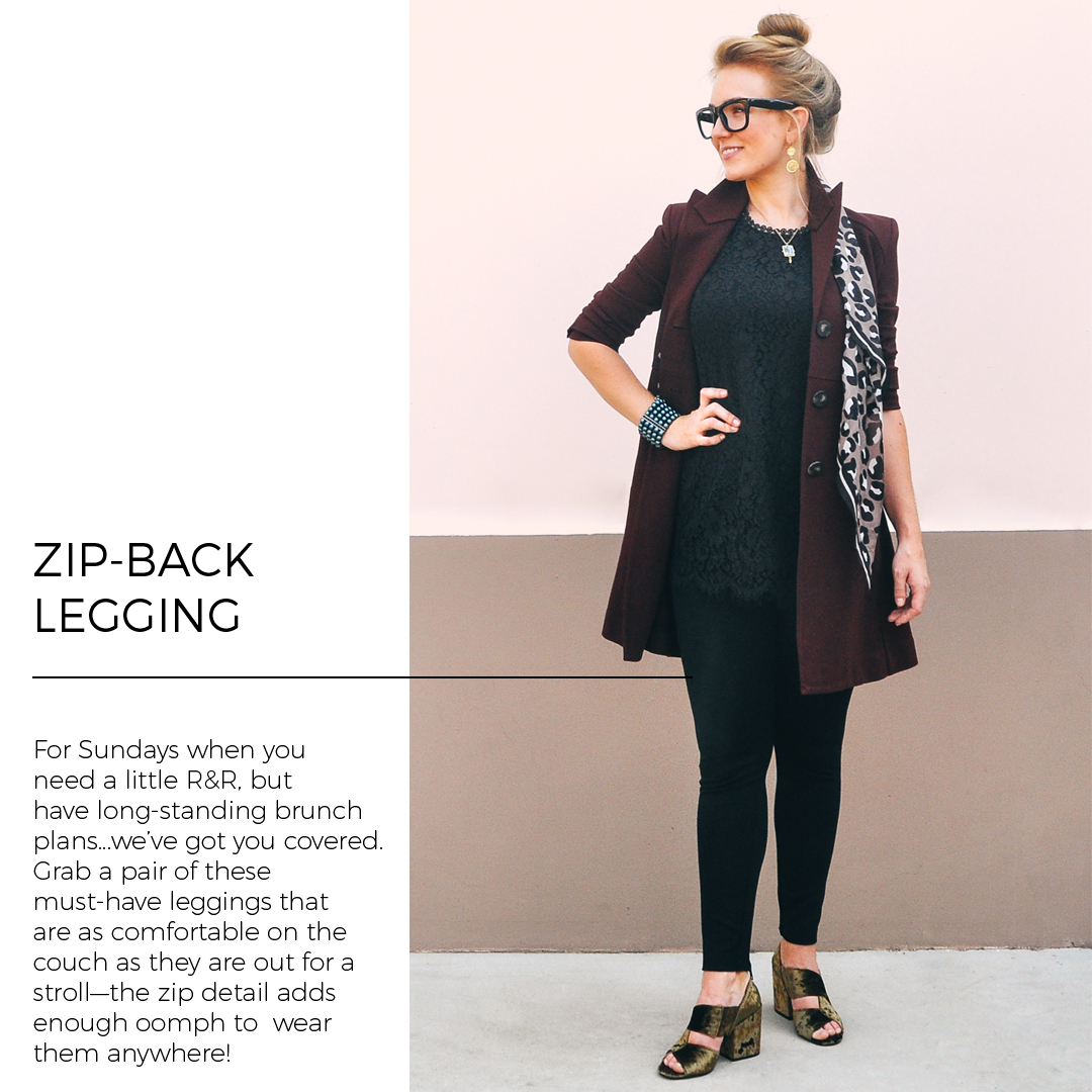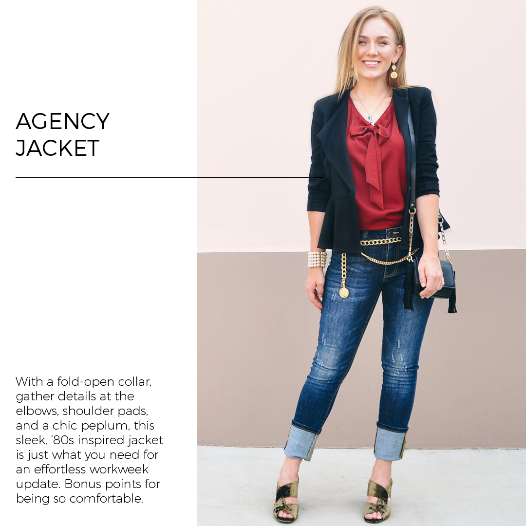 Featured Items: Agency Jacket, Cinch Top, Authentic High Straight, Interlock Block Heel, Athena Necklace