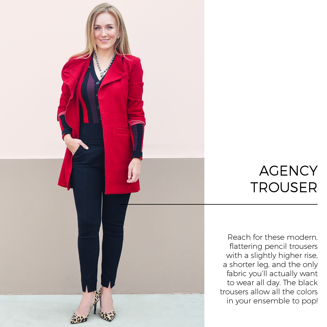 We especially love ponte clothing paired back to bright blouses, cardis and sweaters, jackets and outerwear in tantalizing shades of pink and red, head-turning heels in leopard print, flats with velvet embellishments, and chic suede booties. Or go for a head-to-toe take and let the accessories do the talking: think big pearls, lots of gold, and a belt to cinch it all together. Don’t worry—these jet-black basics cut such a sharp line there’s no risk of them getting lost amongst these brighter hues and bolder patterns. Watch the video for Becky’s take on the trend, and check out our tips on how to rock this capsule collection below!