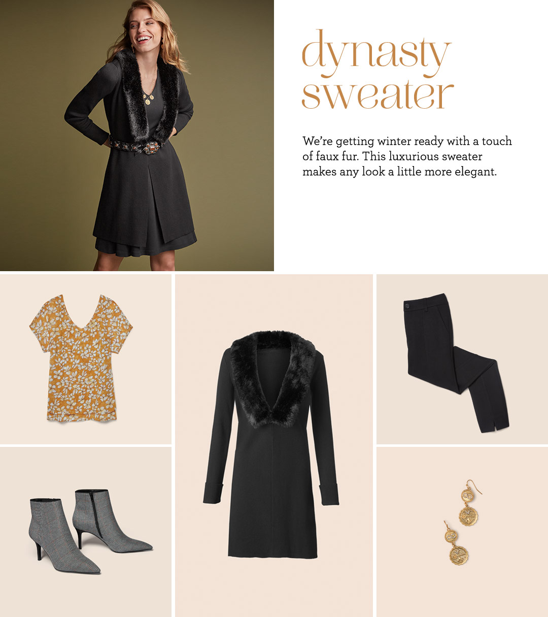As we get ready to head into the holiday season and all the joy and splendor that winter has in store, we wanted to share with you a few New Arrivals that make the most of our fall trends, giving you plenty to pair back to this season’s Collection. There’s a certain polish to these pieces—a sense of grace that imbues every look. You’ll find it in a red velvet dress or a stunning black pantsuit, in a breathtaking sweater with a little fur trim at the neck, or wrapped in a blouse. It’s there, too, in stunning loden green tops and huggable, lovable wraps, in bold plaid checks worn with verve, abandon, and always refinement.