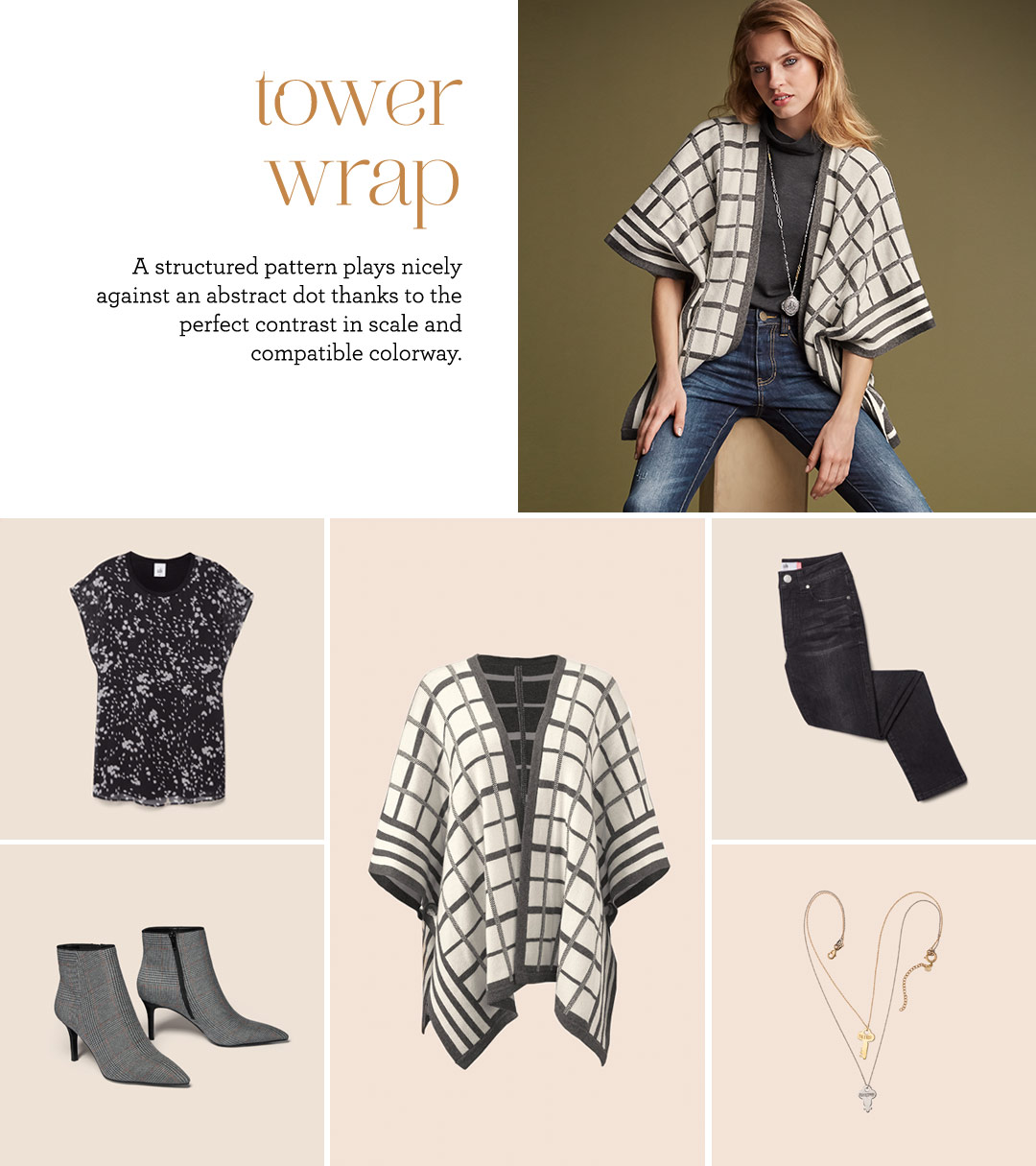 Featured Items: Tower Wrap, Cosmos Top, Smolder High Straight, Dandy Boot, Tribute Necklace