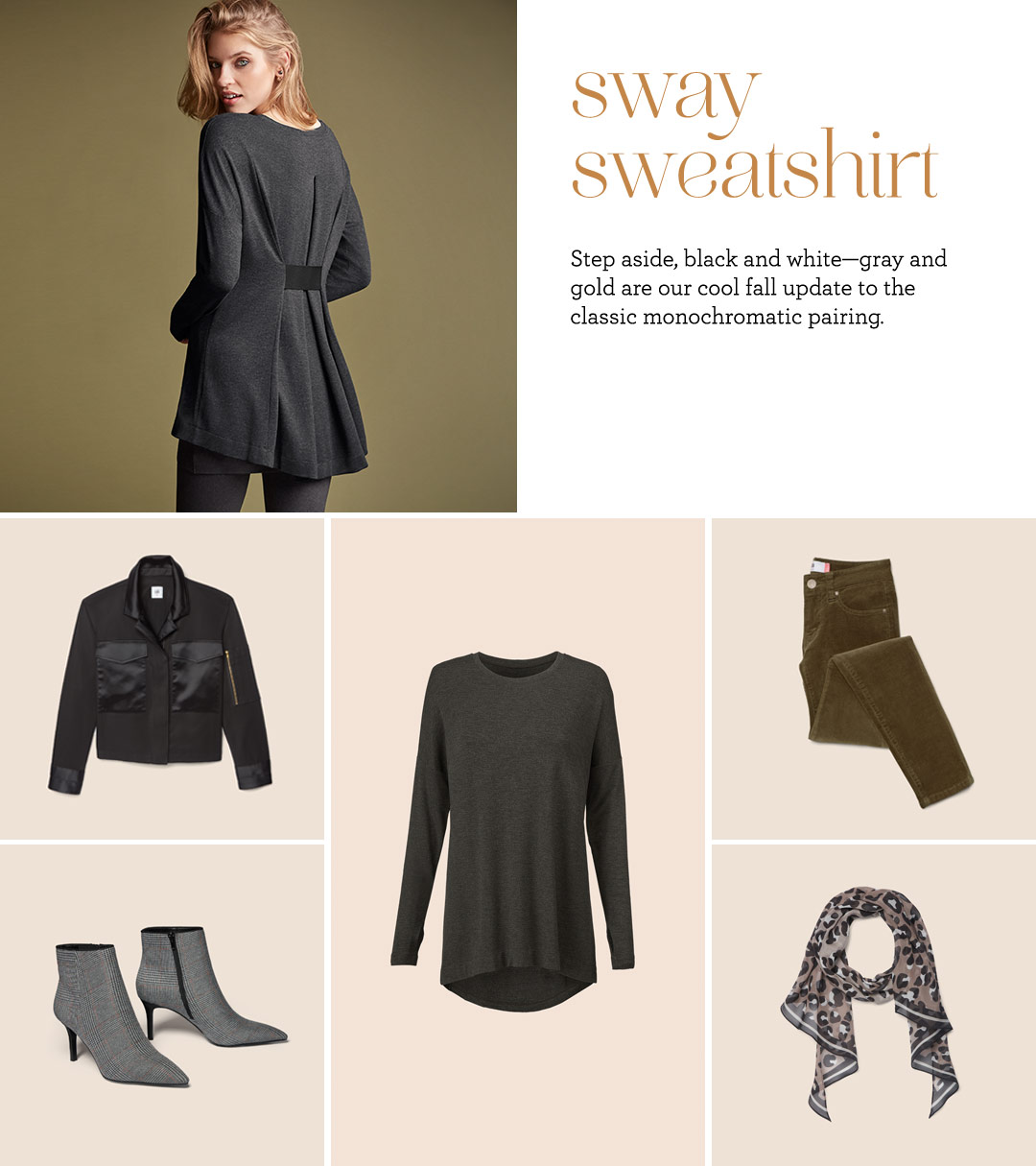 Featured Items: Sway Sweatshirt, Skinny Cord, Back in Black Jacket, Leopard Scarf, Dandy Boot