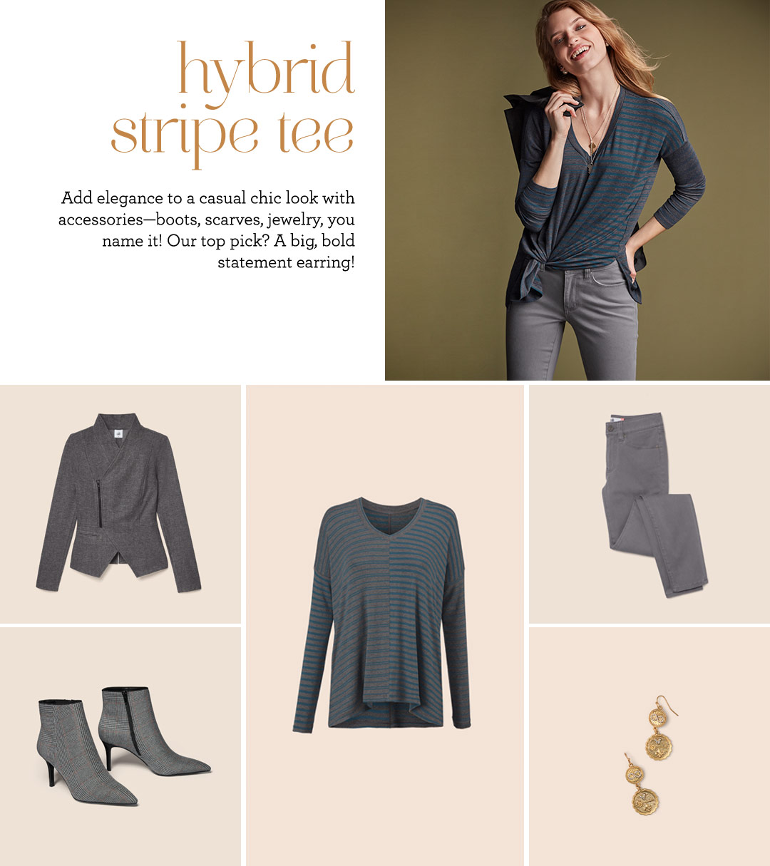 Featured Items: Hybrid Stripe Tee, High Skinny, Rebel Jacket, Dandy Boot, Apollo Earrings