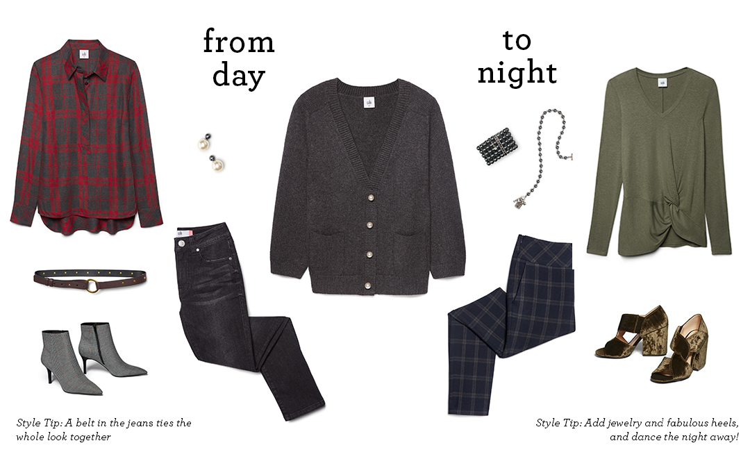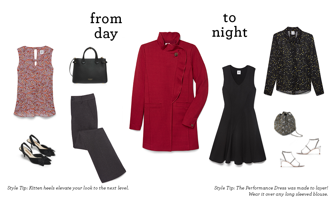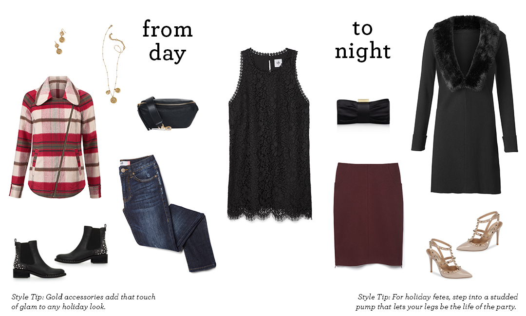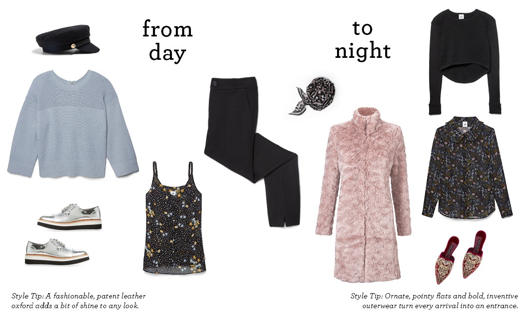 Between wrapping up the year at work, and planning fetes with the family, the holidays are a busy time of year. Who’s got time to change from day to night? Turns out you do. “Impossible!” you might think. But we’ve got a little secret: four key pieces that turn into eight day-to-night holiday outfits, anchoring your look and helping you transition seamlessly.