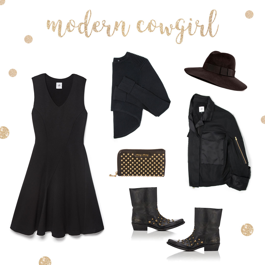 Featured Items: Performance Dress, Prep Pullover, Back in Black Jacket, Studded Cowboy Boots, Hat, Pouch