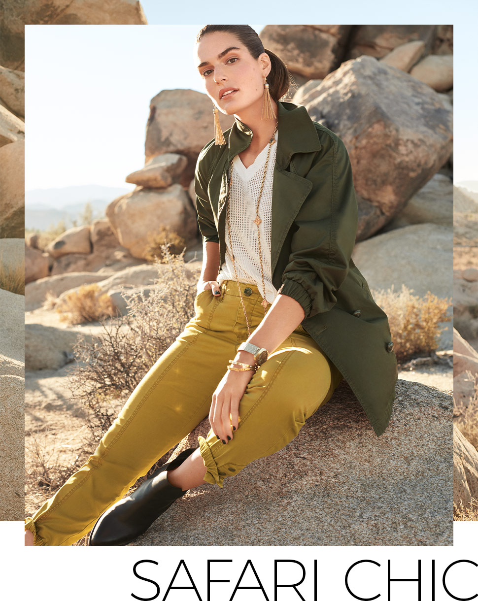 This trend is right at the crossroads where the savannah meets the city. A more neutral palette plays on the colors of the desert. Shades of olive and beige serve as a strong backdrop to your outfit. We’re looking at utilitarian outerwear layered over tailored pieces such as a slim-fit skirt or white skinny jeans for a contrasting silhouette. And let’s not forget about accessories—finish off your earthy look with an elegant hat and skin print details.