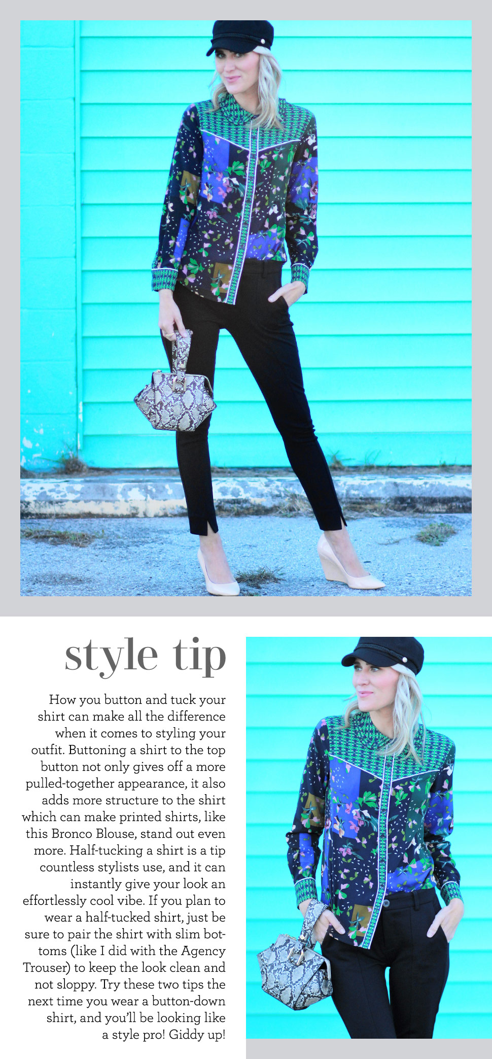 Nothing says spring quite like a fun bold print and bright colors, and the Bronco Blouse from the Spring 2019 Collection could not be more fitting. Of all the pieces in the Collection, this blouse stood out the most for me, and I just knew I had to style it. I’m such a pushover for colorful pieces and a great print, but what made this blouse even better for me was the western style. If you’ve never been a fan of western wear or you’ve been shy to try the new trend, this blouse would be a great way to get your feet wet, as it’s subtle and doesn’t feel like you’re wearing a cowgirl costume. It has piping, like a typical western-style shirt, but the mixed prints and ruffled collar make it unique and oh-so-feminine.