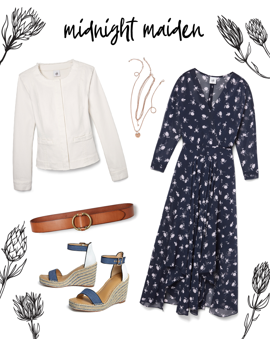 Accessorize with the Safari Belt around your true waist, and add the white Castaway Jacket. Finish off this night sky ensemble with the Parker Wedge and you’ll be ready to dance the night away!