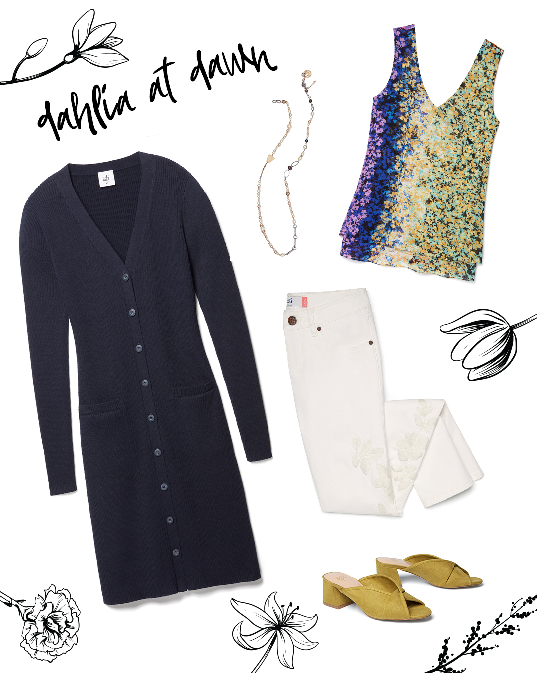 Pair back to our Slim Boyfriend jeans and long, ribbed, and navy body-skimming Counsel Cardigan. Last but not least, match the blouse to a block heel slip-on sandal like our Marigold Mules.