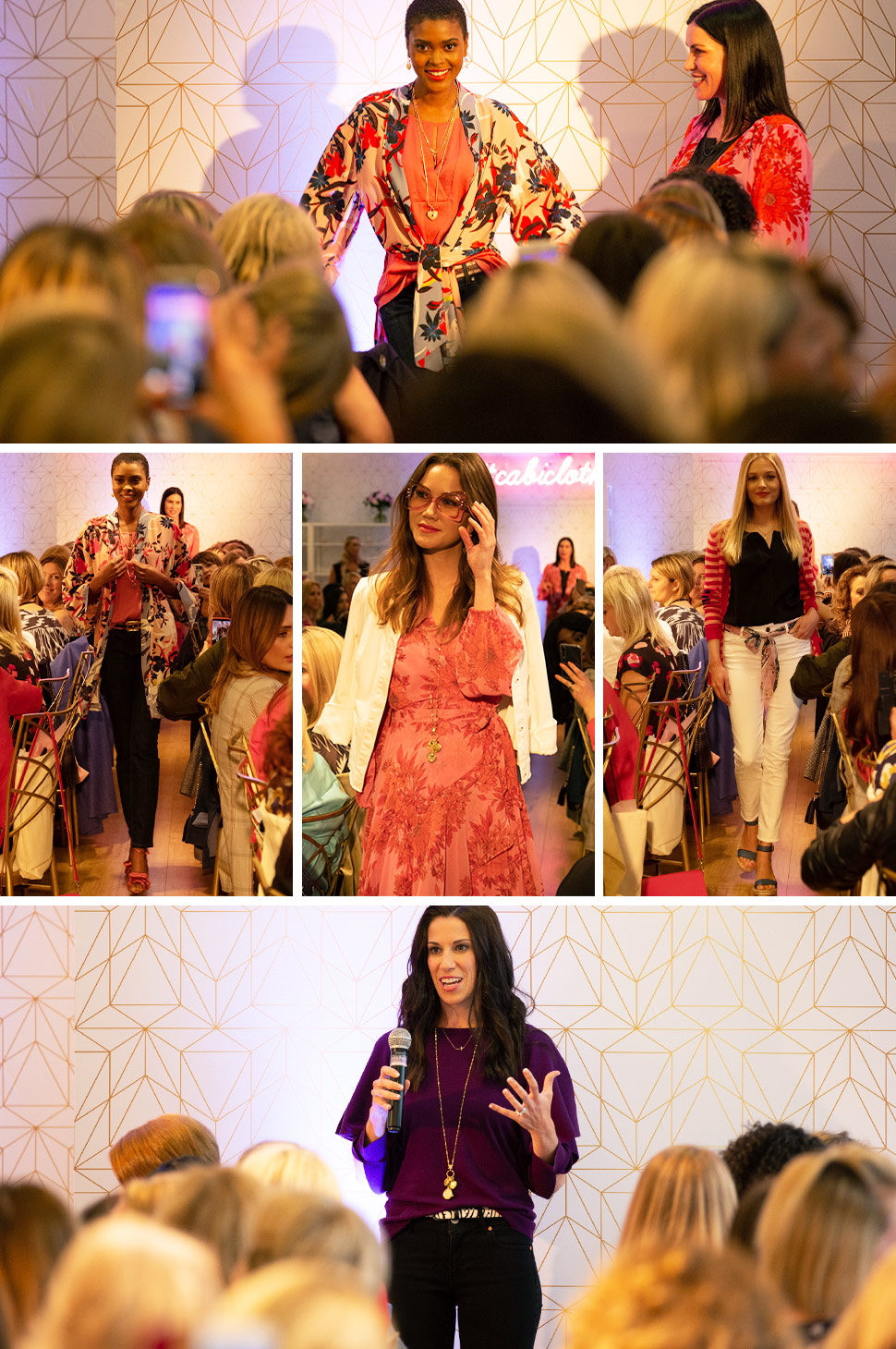 At dinner, Kat Woodside, our Chief Design Officer, led a design presentation and fashion show, featuring some of the top looks from our Spring Collection. Katie Malone, our Chief Marketing Officer, then told the story of how cabi came to be the beautiful company it is today, founded by women for women. After all was said and done, everyone was free to mingle and take some chic pictures in front of our decked out floral step-and-repeat.