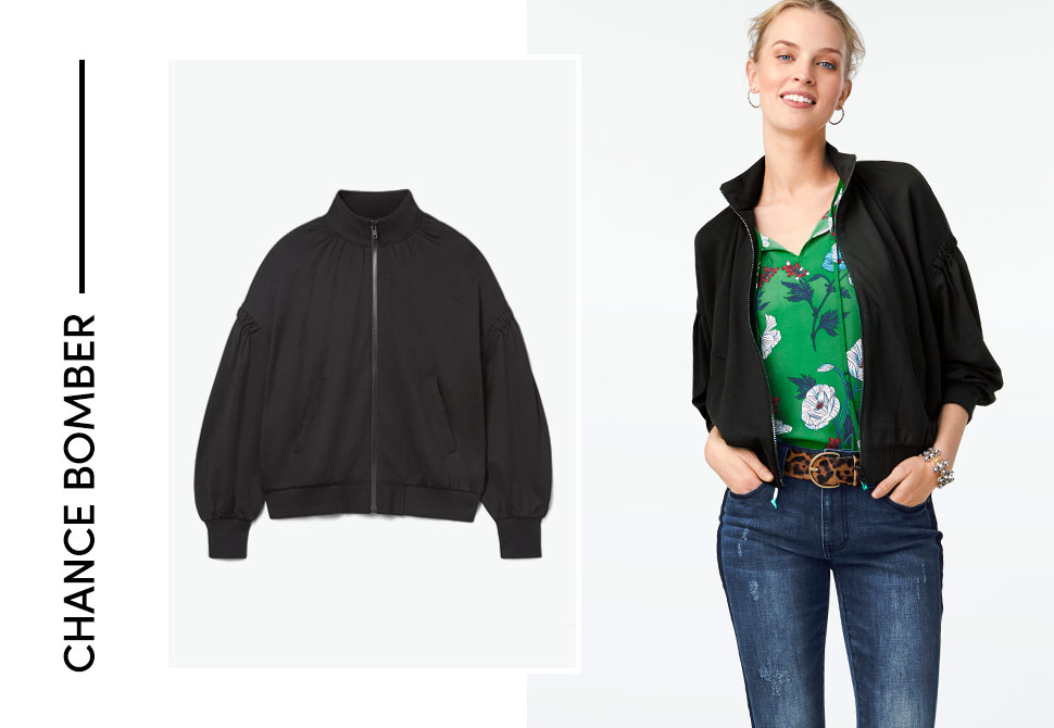 With dropped shoulders and shirred sleeves, this all-black bomber is a fresh take on a trendy style. A bomber makes for the perfect, casual topper—you can’t go wrong! Throw it on over any blouse to add some edge to your look.