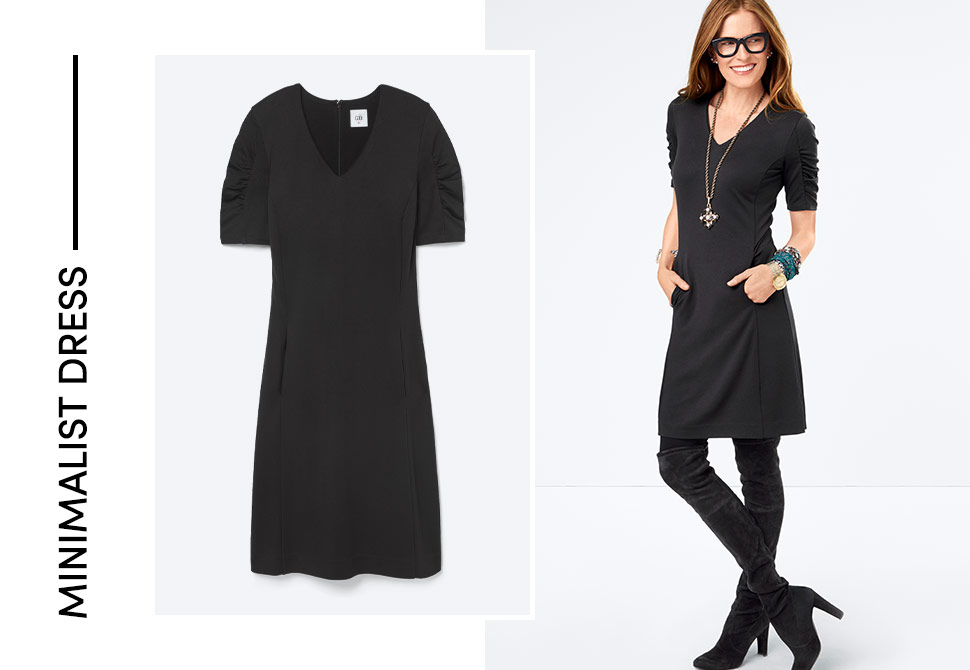 Ah, the coveted little black dress. We all need one (or two…or three!). Our Minimalist Dress is knee length and form fitting with shirred sleeves for a touch of added interest. This classic little black dress can be styled with countless toppers and jackets