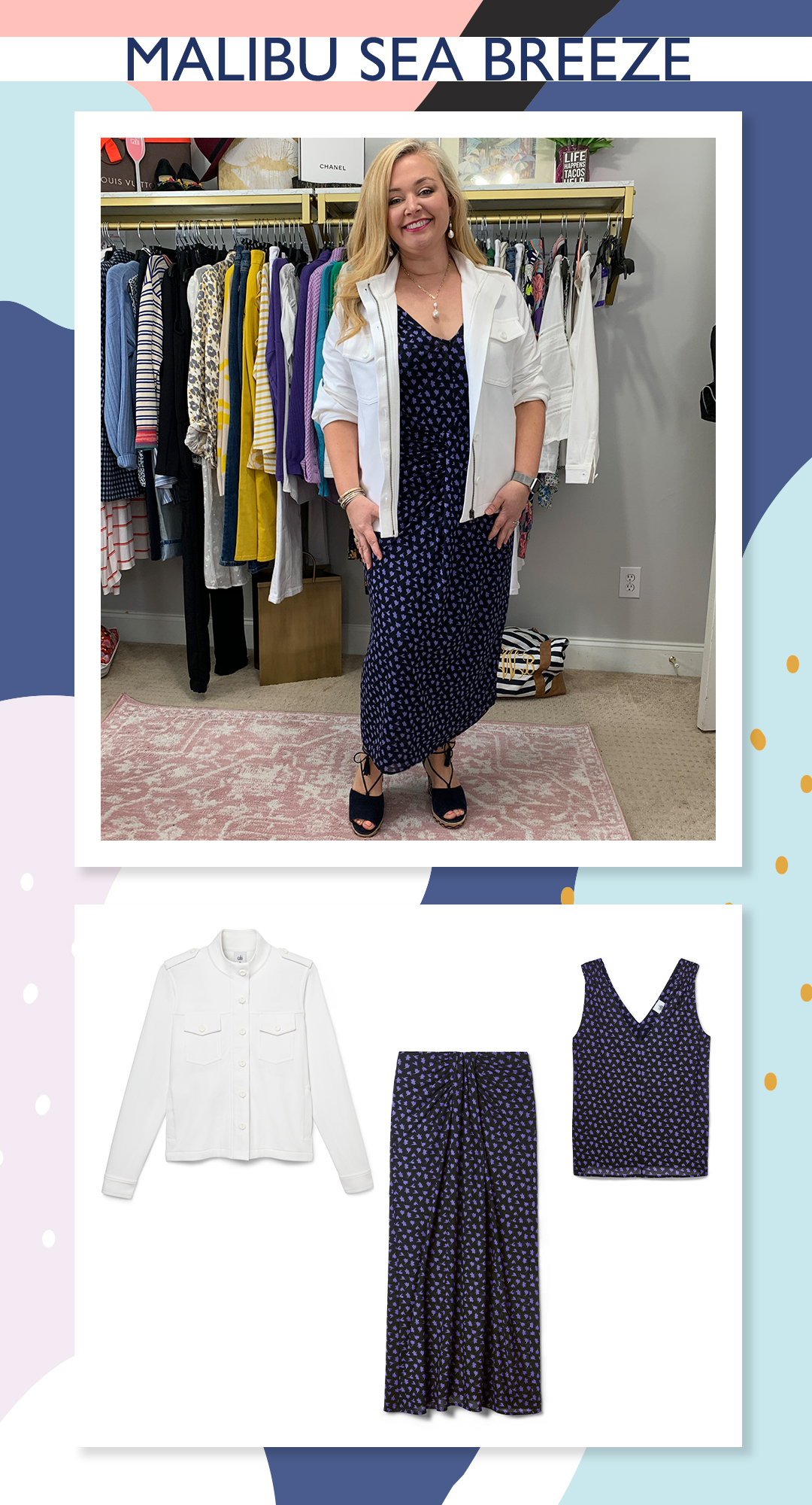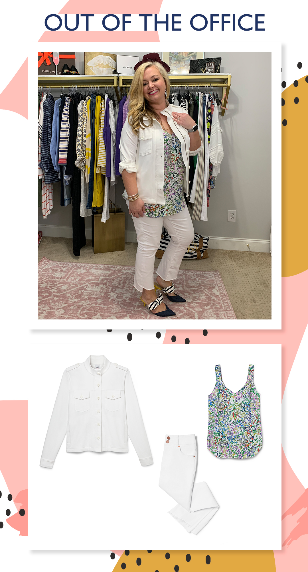 Style Tip: Add a floral blouse for a pop of print against solid colors. It’s the perfect way to spice up a classic navy and white look!