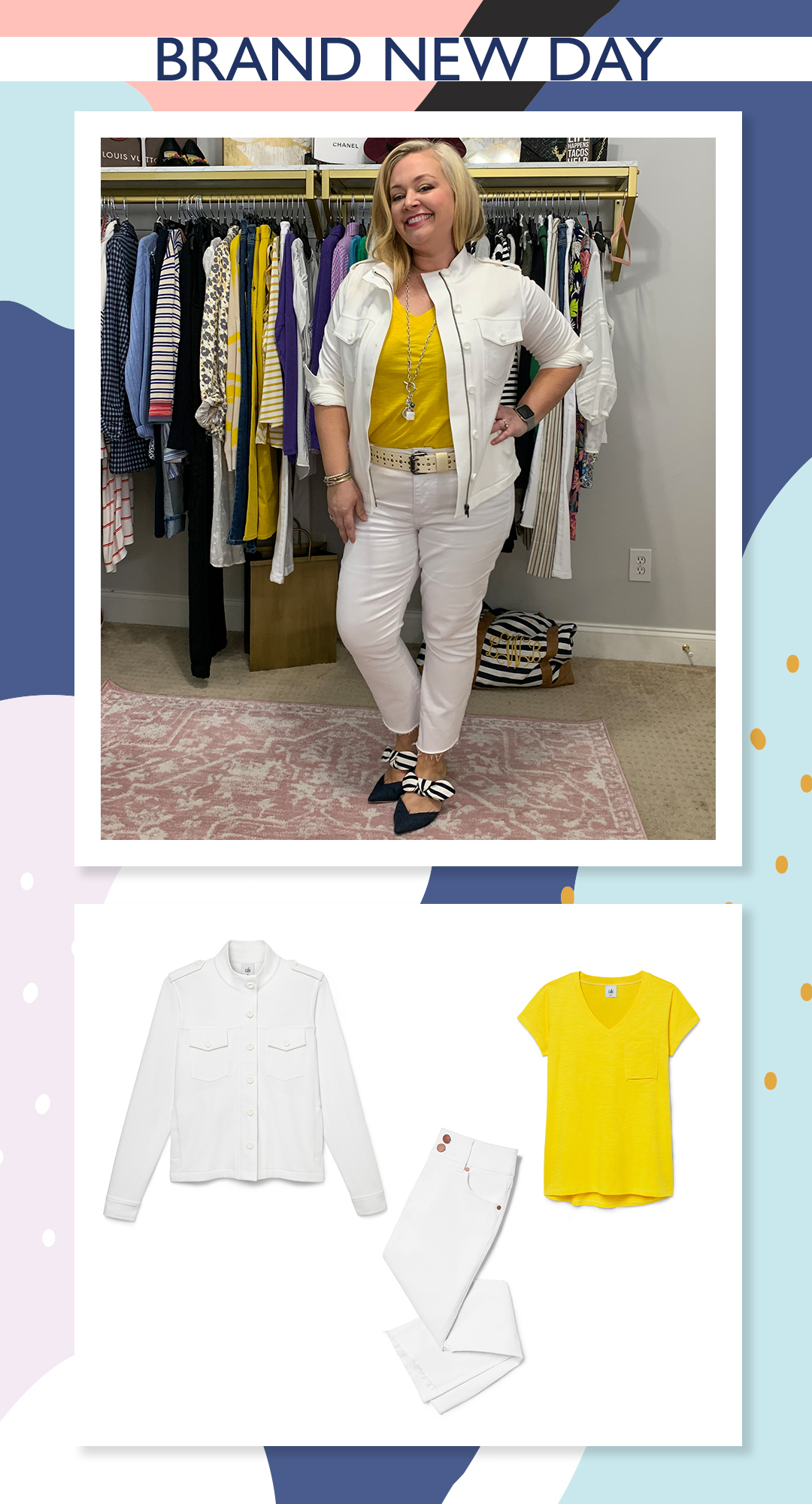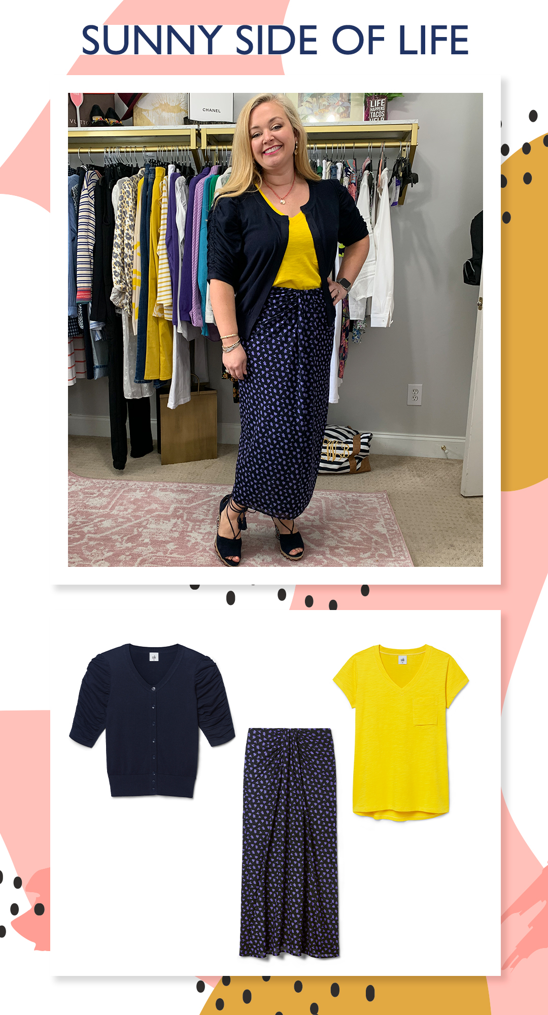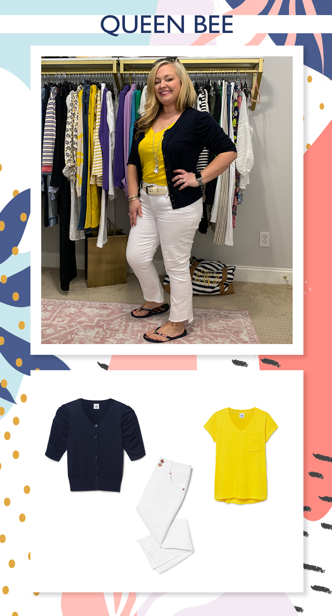 Style Tip: Navy and yellow is a classic summer pairing. Complement this look with white denim.