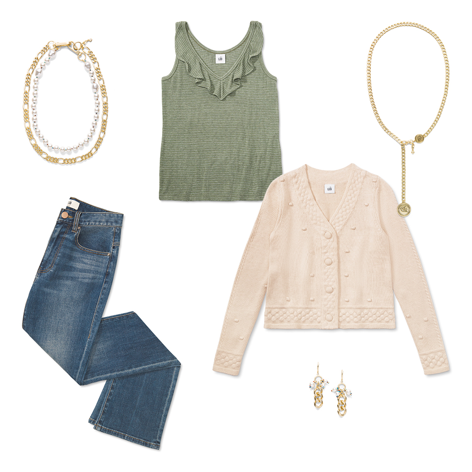 Featured Items: Retro Cardigan, Wink Tank, 5th Avenue Jean, Wisdom Earrings, Mission Necklace, Wisdom Necklace