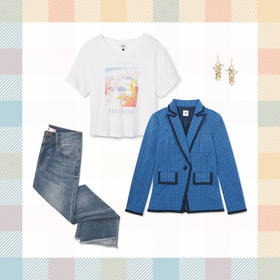 Light wash denim is the perfect pick for springtime. Dress up this casual jeans-and-a-tee look with a blue checkered blazer.