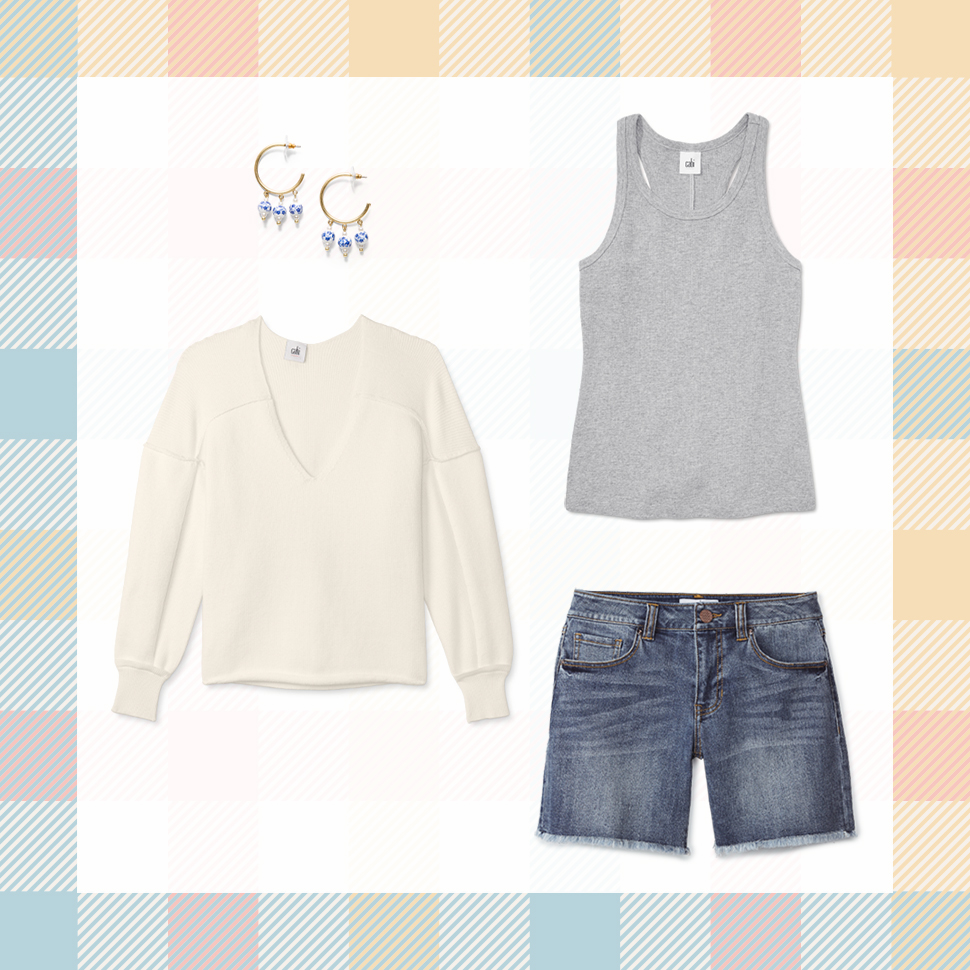 This laid-back, pattern-free look styles the denim A-Line Short back to the vintage white Easy Pullover. Try the gray Paragon Tank underneath for a contemporary mix of neutrals.