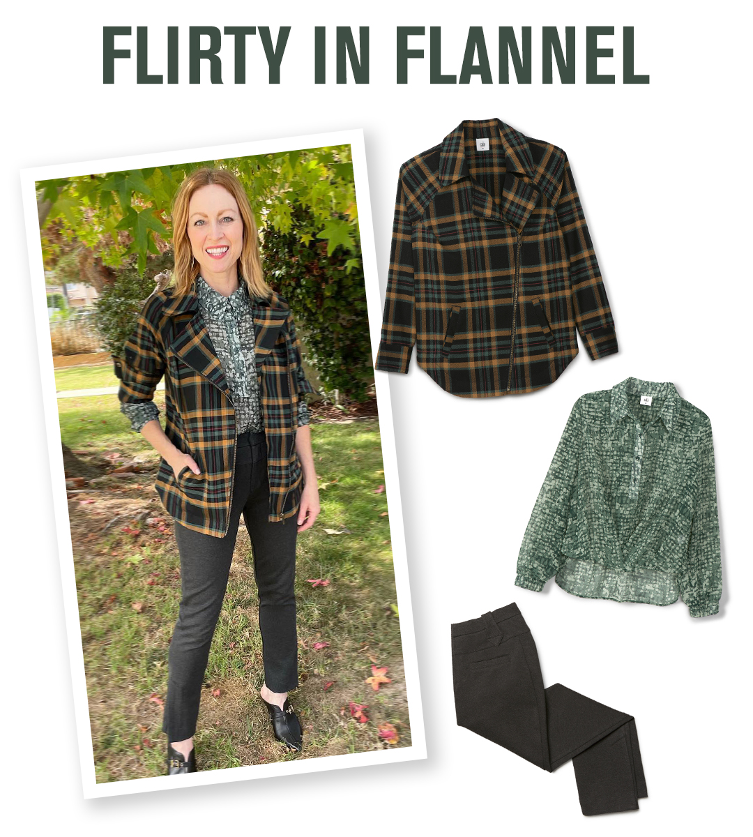 Featured Items: Moto Plaid Jacket, Caliber Blouse, Barrister Trouser