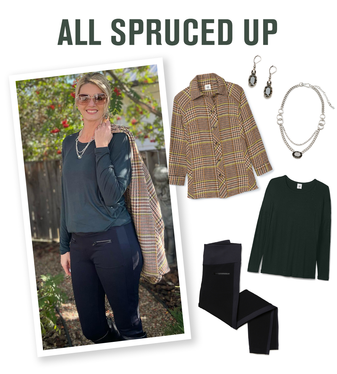 Featured Items: Yorkshire Shacket, Cut Up Tee, Tuxedo Legging, Stellar Earrings, Stellar Necklace